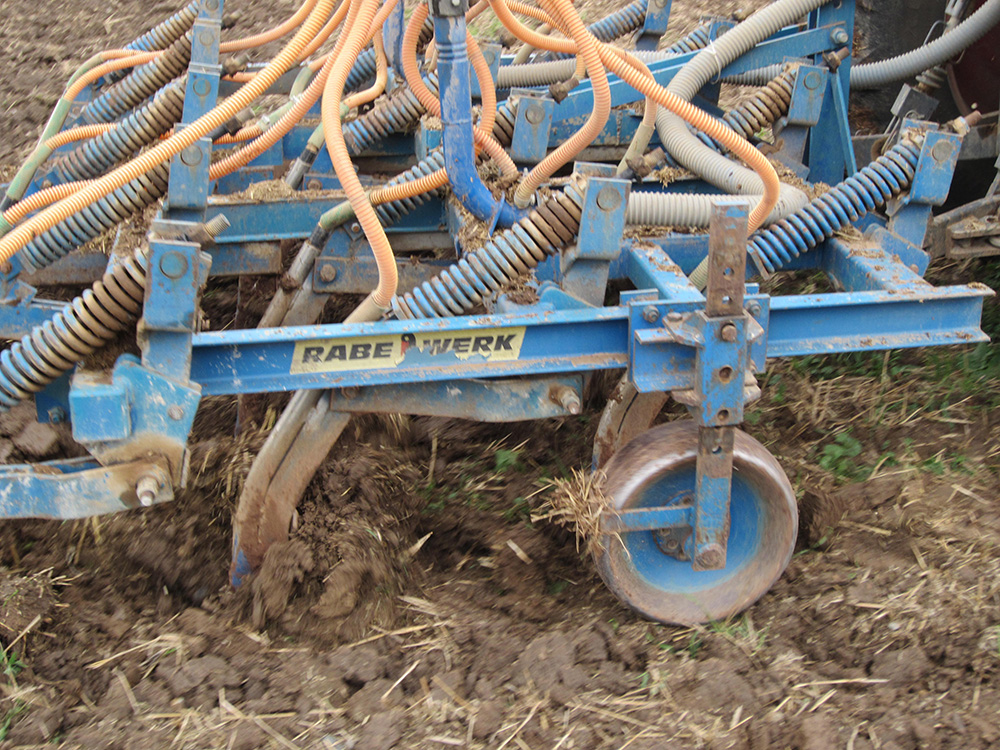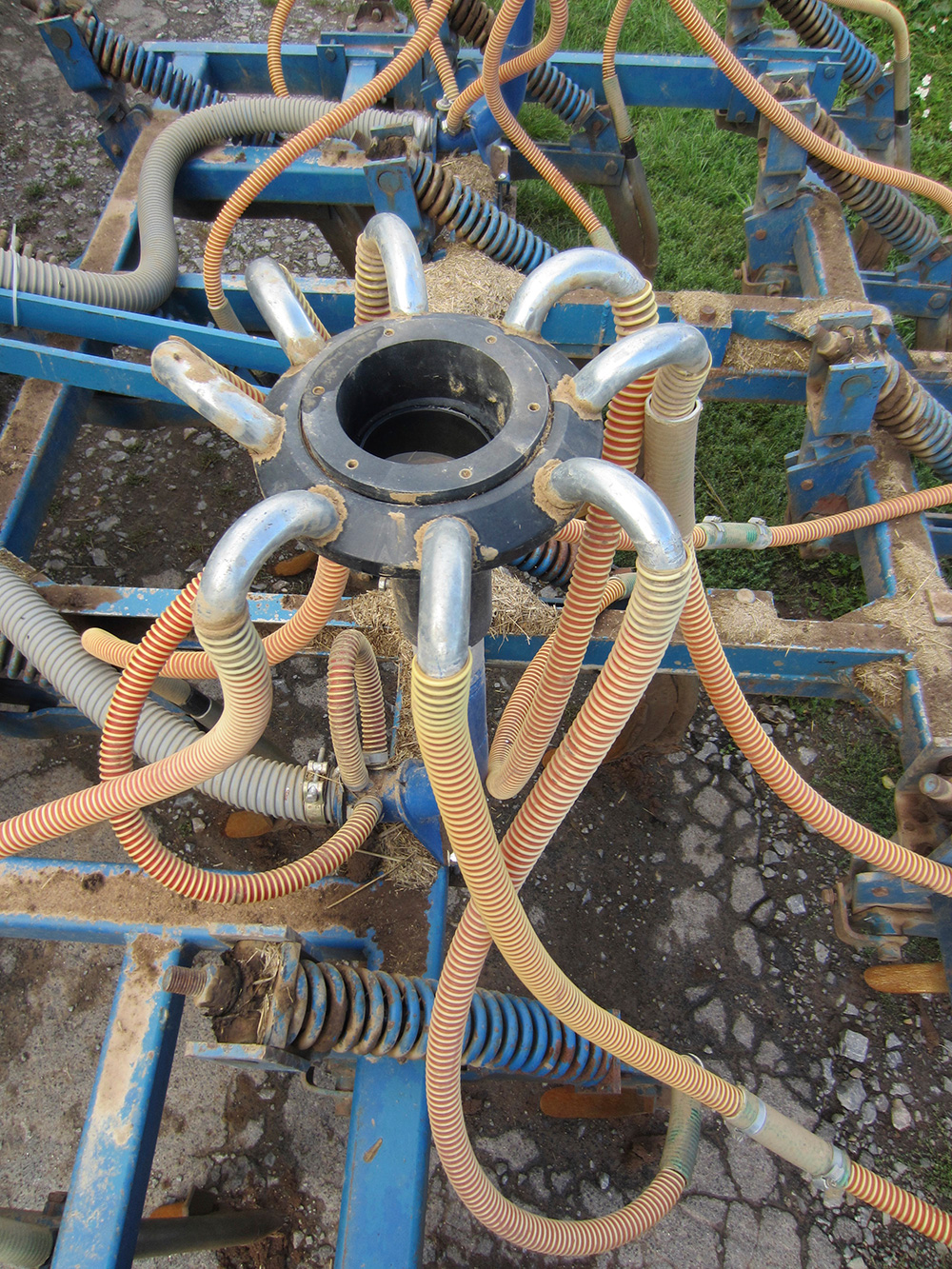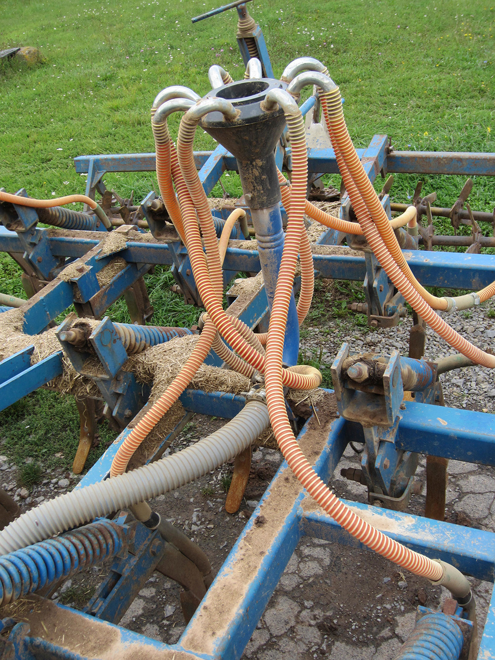 Nachrüstung eines Grubbers auf Kundenwunsch. Dünger wird vom Fronttank über das Gebläse nach hinten transportiert und über zwei Verteiler am Grubberstiel entlang im Boden abgelegt. Diese umweltschonende Methode hat sowohl ökologische als auch ökonomische Vorteile. Sie reduziert erheblich die Auswaschungenen, sorgt für einen geringeren Gesamtdüngerverbrauch und eine bessere Pflanzenverfügbarkeit. Auf dieser Basis konstruieren wir aktuell unsere eigene Grubber-Weiterentwicklung.